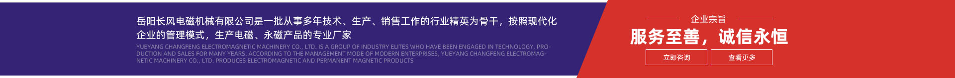 岳陽長風電磁機械有限公司是以原岳陽起重電磁鐵廠一批從事多年技術、生產、銷售工作的行業精英為骨干,按照現代化企業的管理模式,經過資產重組而組建成立的新型科技型股份制企業。工廠既繼承了原岳陽起重電磁鐵廠三十多年來積累的電磁產品開發與生產的理論和實踐經驗,并加以開拓創新,發揚光大;又改變了原國有企業陳舊的管理制度與作風。企業如朝陽噴薄,正不斷發展壯大,具有較好的發展前景。